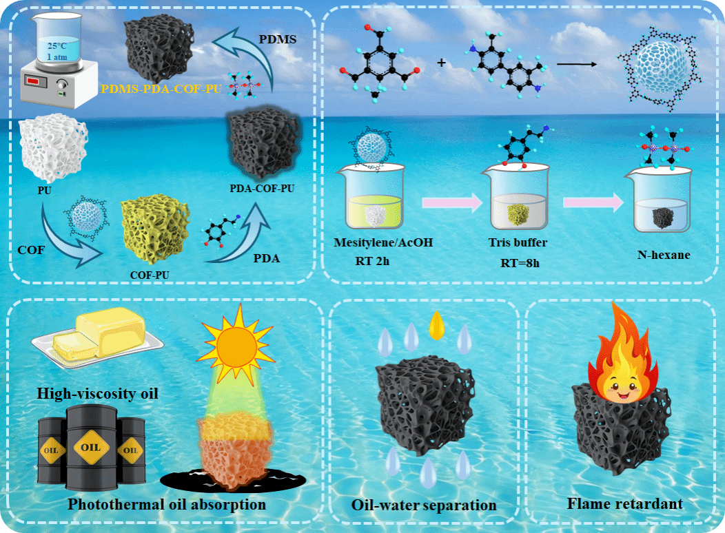海上溢油事故频发,高粘度原油的高效回收与分离是当前环保与资源循环利用的重要挑战。传统分离方法效率低、能耗高,难以适应复杂工况。本研究成功构建了一种具有多层次结构的光热超疏水复合海绵(PPCPS)。该材料以聚氨酯海绵为骨架,通过原位聚合共价有机框架(COF)增强结构稳定性与界面作用位点,进一步修饰聚多巴胺(PDA)以提升光热转化能力,最后经聚二甲基硅氧烷(PDMS)疏水改性,形成具有优异综合性能的油水分离材料。PPCPS表现出显著的超疏水特性,水接触角达154.42°,对多种油类及有机溶剂具备高吸附容量(最高48.7 g/g)。在1.0 kW/m⟡模拟太阳光照射下,材料表面温度迅速升至70.1℃,有效降低了高粘度原油的黏度,提升其流动性,从而大幅提高分离效率。经历50次循环使用后,油水分离效率仍稳定在99.6%以上,并表现出良好的机械强度、化学稳定性及阻燃性能。该研究通过COF骨架支撑、PDA光热转换与PDMS疏水修饰的协同设计,实现了材料在结构稳定、光热响应与表面润湿性方面的多功能集成,为太阳能驱动的高效、持续原油回收提供了新材料与技术路径,对推动绿色化工与环境污染治理具有重要意义。