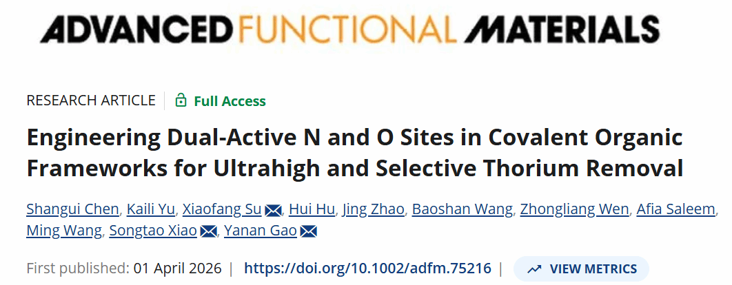 能源材料先进制造与应用团队基于软硬酸碱(HSAB)理论,设计合成了一系列富氧基团功能化的亚胺键连接二维共价有机框架(2D COFs)。凭借骨架中丰富的高亲和性双活性N,O位点,材料实现了快速吸附动力学与卓越的Th(IV)捕获性能。相关研究成果以“Engineering Dual-Active N and O Sites in Covalent Organic Frameworks for Ultrahigh and Selective Thorium Removal”为题发表于期刊《Advanced Functional Materials》(中国科学院一区Top,IF=19)。小黄书